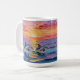 An ai impasto style dolphins swimming with a pink, orange and purple sunset over the ocean . A beautiful coastal coffee cup to add a beachy touch to your drinkware.
