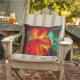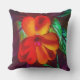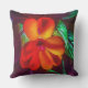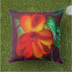 This large Throw Pillow features an original photograph of a red orange impatiens flower. Sunlight adds yellow highlights to the petals and brightens the green leaves, giving a crisp edge to the purple shadows on the leaves below.