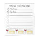 Notepad design features an original illustration of a row of wine glasses and wedges of creamy brie cheese, with IMPORTANT THINGS TO DO TODAY in a fun font, and "drink wine" and "eat cheese" already checked off the list.