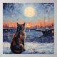 An impressionist style design featuring a cat overlooking a body of water in winter