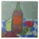 A bottle of red wine sits on a blue and white chequerboard tablecloth in this impressionist still life. Surrounding the green glass bottle are bunches of red and white grapes, a wedge of cheese and a clear glass filled with red wine. Perfect as a trivet or just for kitchen decor. From my original digitally created image.