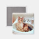Magnet with my original photo, digitally altered to look like an impressionist painting of a kitty sitting in a sink basin. The cat is mostly white with brown, orange, and black markings. She has a bright pink nose and big blue eyes. Her expression seems to say, "Where are the bubbles?" The sink is white with old fashioned chrome fixtures. A bright peach towel that nearly matches the orange markings on the kitty hangs nearby. The edges of the image have a soft, unfinished appearance. Sure to tickle the heart of any cat lover. This design works well on both the square and the round magnets.