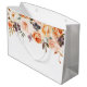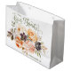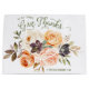 This gift bag has a pretty rose floral bouquet and features a Bible verse. Colours used include olive green, peach, plum, blush and orange. At the top is stylised text in green that says "In all Things Give Thanks." Everything is displayed on a white background. Coordinates with the Shabby Chic Peach Rose collection.