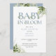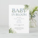 Baby in bloom baby shower invitation featuring elegant dusty blue typography and pretty botanical greenery foliage and your QR code on the reverse. Designed by Thisisnotme©