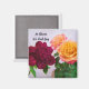 A photograph of a burgundy peony paired with orange-pink English roses, capturing a lovely and uplifting message: 'In Bloom We Find Joy.'