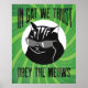 Vintage Style Poster. Grüner Hintergrund und eine schwarze Katze mit Sonnenbrille. Dazu der Text In Cat we Trust. Obey the Meows