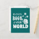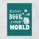 This design reads 'In Every Book A Whole World' and is accompanied by a pile of books with flowers growing from it. It's a beautiful design, perfect for people who love to lose themselves in a good book. A good quality postcard, this is also a great way to tell people about new book events, book clubs and book launches.