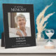 Personalised funeral memorial black photo plaque featuring a large picture of your loved one, the text in loving memory of , their name, birth/death dates, and the remembrance saying we will always carry you in our hearts. on the back there is the photo and text saying fly high grandma. a special keepsake to treasure forever.