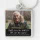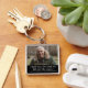 Simple elegant in loving memory of key chain features single photograph and calligraphy script '' I will carry you with me till I see you again'' in white on a black background.