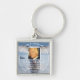 Memorial Photo Keychain with a beautiful swan with open wings swimming in the water background, centre photo and personalizable text. From HAMbyWhiteGlove aka HAMbyWG