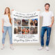 Personalized memorial tribute fleece blanket featuring 6 precious photos of your lost loved one, the text "in loving memory", their name, birth/death dates, and the remembrance saying "your presence we miss, your memory we treasure, loving you always, forgetting you never".