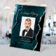 An elegant sign to honor a departed family member at your wedding. A teal blue watercolor agate design edged with silver faux glitter provides the background. The words "In Loving Memory" appear in silver gray handwriting calligraphy. Easily replace the sample image with a vertical photo of your loved one, and add their name and relationship below in serif font.