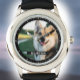 Remember a loved pet animal by having its photograph and name on a stylish wristwatch. Upload a treasured photo to show your own pet dog or cat. Change the wording to the name you gave to your pet.