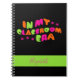 This notebook features the words, "In my classroom era" on it in fun curvy letters on a black background. A few hot pink flowers appear on the design. In addition, you can customise the notebook with your name. This is a great notebook for the teacher or for anyone in the classroom. Copyright Kathy Henis