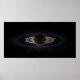 With giant Saturn hanging in the blackness and sheltering Cassini from the sun's blinding glare, the spacecraft viewed the rings as never before, revealing previously unknown faint rings and even glimpsing its home world. This marvellous panoramic view was created by combining a total of 165 images taken by the Cassini wide-angle camera over nearly three hours on Sept. 15, 2006. The full mosaic consists of three rows of nine wide-angle camera footprints; only a portion of the full mosaic is shown here. Colour in the view was created by digitally compositing ultraviolet, infrared and clear filter images and was then adjusted to resemble natural colour. The mosaic images were acquired as the spacecraft drifted in the darkness of Saturn's shadow for about 12 hours, allowing a multitude of unique observations of the microscopic particles that compose Saturn's faint rings. Ring structures containing these tiny particles brighten substantially at high phase angles: i.e., viewing angles where the sun is almost directly behind the objects being imaged. During this period of observation Cassini detected two new faint rings: one coincident with the shared orbit of the moons Janus and Epimetheus, and another coincident with Pallene's orbit. (See PIA08322 and PIA08328 for more on the two new rings.) The narrowly confined G ring is easily seen here, outside the bright main rings. Encircling the entire system is the much more extended E ring. The icy plumes of Enceladus, whose eruptions supply the E ring particles, betray the moon's position in the E ring's left-side edge. Interior to the G ring and above the brighter main rings is the pale dot of Earth. Cassini views its point of origin from over a billion kilometres (and close to a billion miles) away in the icy depths of the outer solar system. See PIA08324 for a similar view of Earth taken during this observation. Small grains are pushed about by sunlight and electromagnetic forces. Hence, their distribution tells much about the local space environment. A second version of the mosaic view is presented here in which the colour contrast is greatly exaggerated. In such views, imaging scientists have noticed colour variations across the diffuse rings that imply active processes sort the particles in the ring according to their sizes. Looking at the E ring in this colour-exaggerated view, the distribution of colour across and along the ring appears to be different between the right side and the left. Scientists are not sure yet how to explain these differences, though the difference in phase angle between right and left may be part of the explanation. The phase angle is about 179 degrees on Saturn. The main rings are overexposed in a few places. This view looks towards the unlit side of the rings from about 15 degrees above the ringplane. Cassini was approximately 2.2 million kilometres (1.3 million miles) from Saturn when the images in this mosaic were taken. Image scale on Saturn is about 260 kilometres (162 miles) per pixel. The Cassini-Huygens mission is a cooperative project of NASA, the European Space Agency and the Italian Space Agency. The Jet Propulsion Laboratory, a division of the California Institute of Technology in Pasadena, manages the mission for NASA's Science Mission Directorate, Washington, D.C. The Cassini orbiter and its two onboard cameras were designed, developed and assembled at JPL. The imaging operations centre is based at the Space Science Institute in Boulder, Colo.
