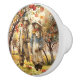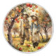 Two scarecrows stand among apple trees in an orchard, surrounded by ripe apples both on the branches and scattered on the ground. They are dressed in old clothes and have hats on their heads, standing still in the peaceful, sunlit setting. Digital Art