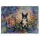 This image features a black-headed tri-colored corgi amidst a vibrant field of flowers. The artwork is rendered in a fluid alcohol ink style, creating a unique visual effect.