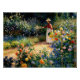 "In the Garden" is a vibrant depiction of outdoor life. The scene portrays a lush garden filled with blooming flowers, where a single figure is leisurely enjoying the serene environment. The central figure, often believed to be Monet's wife, Camille, is carrying a flower basket surrounded by a profusion of colourful flowers. The painting is chraacterised by its rich use of colour, dappled light, and the delicate interplay of shadow and sunlight, which creates a sense of warmth and tranquillity. The loose brushwork and attention to the effects of light on natural elements reflect an Impressionist style, emphasizing the beauty of everyday moments spent in nature. This work captures the essence of a peaceful, sunlit afternoon in a garden, where the vibrancy of the flowers and the gentle atmosphere combine to create a timeless scene of relaxation and contentment.