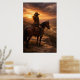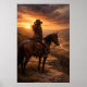 A lone rider pauses on horseback overlooking a sweeping valley as golden light breaks through dramatic evening clouds. This peaceful western landscape captures a quiet moment of reflection and freedom on the open range.