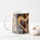 A photo of a heart shaped frame hanging from a rustic wooden fence shows the unique textures of wood and weather. Message is ' But First Coffee" or add your own message for a unique and personalised coffee mug.