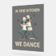 Cute kitchen design "In this kitchen we dance" design depicts a watercolor illustration of two frogs wearing a chef's hat and dancing. This gray, teal, and white washroom design makes a nice gift for anyone who likes frogs and funny kitchen posters.