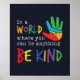 A powerful and trendy motivational typography art print with the quote In a World where you can be anything, Be Kind in rainbow colours with a multi coloured jigsaw puzzle hand illustration.