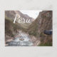 Postcard of the blue train of the Inca rail running from Cusco towards Machu Picchu through the Sacred Valley or Urubamba Valley with big mountains and Urubamba river in Peru with the text: 'Peru'.