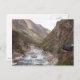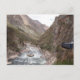 Postcard of the blue train of the Inca rail running from Cusco towards Machu Picchu through the Sacred Valley or Urubamba Valley with big mountains and Urubamba river in Peru.