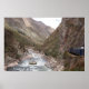 Poster print of the blue train of the Inca rail running from Cusco towards Machu Picchu through the Sacred Valley or Urubamba Valley with big mountains and Urubamba river in Peru.
