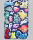 A group of whimsical, colourful ghosts fills the space, Each figure is unique, featuring different patterns and hues that provide a playful and vibrant contrast. The overall effect is lively and imaginative, evoking a sense of fun and mystery.