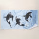 Incredible watercolor orcas art of swimming and jumping orcas and a baby orca with water splashes and waves.