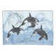 Incredible watercolor orcas art of swimming and jumping orcas and a baby orca with water splashes and waves.