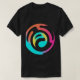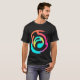 The T-shirt features a vivid, neon-lit cityscape at night, with towering skyscrapers and flying vehicles creating a bustling skyline. The central focus is a sleek, armored figure standing on a glowing platform, holding a futuristic device emitting holographic projections. The background showcases intricate digital patterns, blending vibrant hues of electric blue, magenta, and neon green. Bold, sharp typography with a glitch effect spells out an empowering message, such as "Future Unbound."