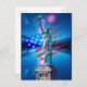 The Statue of Liberty stands prominently with vibrant fireworks illuminating the night sky in the background. Stylised red and blue stripes along with star patterns evoke a patriotic theme. Independence day. Freedom. United States of America Birthday. Digital Art