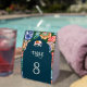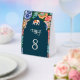 Elegant wedding table number featuring a beautiful arch and colorful artwork.