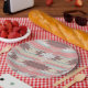 A graphic design in the style of American Indian blankets. Add matching paper napkins for a great looking place setting at your next party or event.