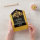 A beautiful and regal all-in-one invitation featuring luxurious golden elephants wearing henna adorned blankets framed by a black inlay or round circle edged with faux gold and a lush damask vibrant backdrop. White text templates for your custom wording appear on both sides. The bottom third has a tear off response card with personalised rsvp address for your guests to complete set on the same golden damask backdrop. These are ideal for Hindi, Hindu, Sanatani Dharma and ethnic asian weddings weddings, engagements, anniversaries; bridal showers and birthday parties. Simply change the wording to suit your special event or occasion.