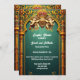 Celebrate the bridal couple with this generativecontent regal design featuring an ornate gold border made of upright palace pillars and arches on which two royal Indian Elephants adorned with henna appear. The elephants have a crest with a royal crown between them and white text templates below them for your custom wording. The rich dark teal, burgundy and golden hues give an elegant, timeless and traditional Indian feel to the overall design. The back of the invitation has an additional template for any extra information that your guests may require. If no extra detail is needed, siimply delete the wording on the back. This striking graphic design is ideal to celebrate Mehndi; Mehendi; Sangeet or any ethnic Asian wedding celebration or event in favour of a bridal couple.