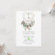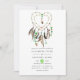 Native american tribal wedding invitation featuring a dream-catcher with feathers and dazzling emerald gemstones.