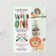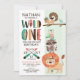 Indian Native American pow wow birthday theme with tribal lion, racoon, owl, and squirrel perched on tree branch and novelty text and arrow date.