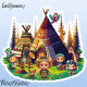 Unique Indigenous whimsical cartoon graphic sticker for boys and girls including cute American Indian kids, Tipi Huts & playful wild animals (macaw parrot, bald eagle, pony, pig, turtle and bird) in the enchanted woodland forest.