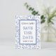 Indigo blue pattern with leaves and a white frame with scalloped border adorn this Save the Date postcard. It is ideal for a summer wedding.