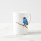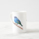 This coffee mug features an indigo bunting. This striking blue bird is pictured on a branch.