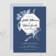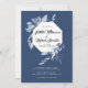 A white geometric shape is edged in gold and surrounded by indigo and light blue flowers. The wedding couple's names and invitation to their wedding is in the centre. The remaining wedding details are below. Indigo blue surrounds the entire design. The text beneath the white hexagon is white. The back of the invitation is coloured light blue to coordinate with the floral design on the front.