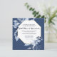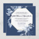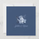 An elegantly-shaped geometric gold frame is surrounded by blue flowers in the upper left and bottom right corners. The flowers are a very pretty combination of dark navy blue flowers to the lightest silver blue. The wedding details are in the centre on white. Deep indigo blue frames the outer portion of the geometric and floral design. The back of the design is also indigo blue and has a floral arrangement in the centre with the wedding couple's names below.