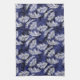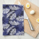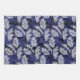 White palm leaves on an indigo blue background, layered with more blue palm fronds.