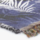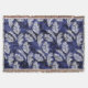 White palm leaves on an indigo blue background, layered with more blue palm fronds.