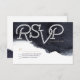 Modern chic simple typographic RSVP design on dark indigo blue watercolor background, great for modern wedding, evening wedding or nautical wedding.