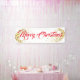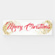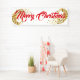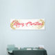 This Holiday banner is shown in the indoor style, Shown in White with Red "Merry Christmas" fancy script with two Gold looking swirls of stars on each end.