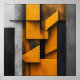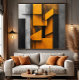 Abstract composition with overlapping geometric panels in metallic orange, black, and concrete grey. Worn industrial textures create depth and visual drama. Modern architectural design ideal for contemporary decor, offices, or urban spaces. Bring visual impact and industrial sophistication to your environment with this unique artistic piece.